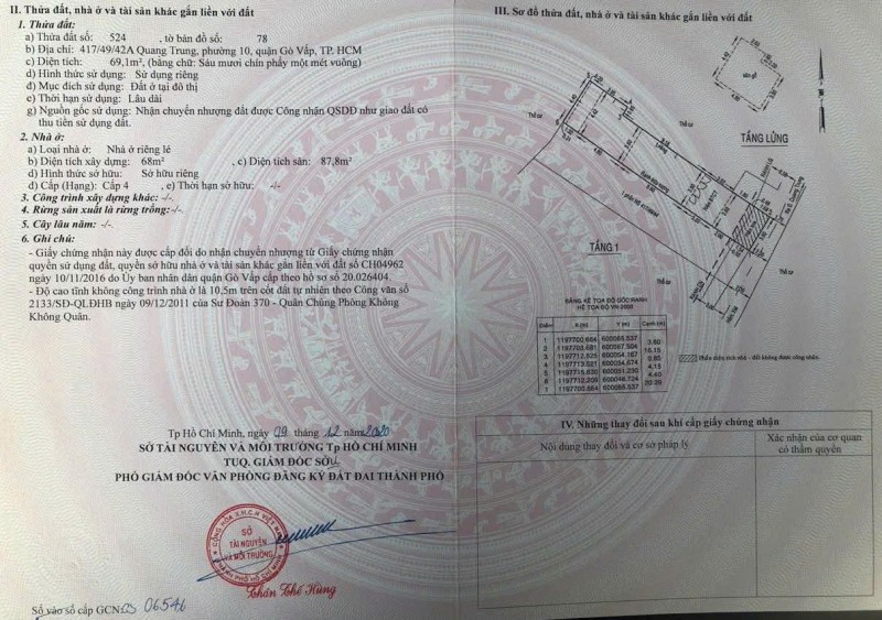 Đất hẻm 417/49/42A Quang Trung, Phường 10, Gò Vấp, Hẻm 2,5m, 3,6x20m, NH 4,4m, Cn 69,1 m2, 4,85 tỷ TL Lộc
