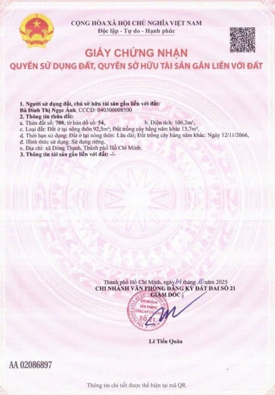Đất hẻm Đông Thạnh 7, Xã Đông Thạnh, Huyện Hóc Môn, Hẻm 4m, 5x21m, Cn 106,2 m2, 3,5 tỷ TL