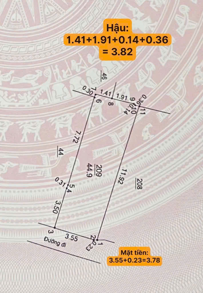 - Sổ đẹp nở hậu. Mặt tiền 3.78m, Hậu 3.82m