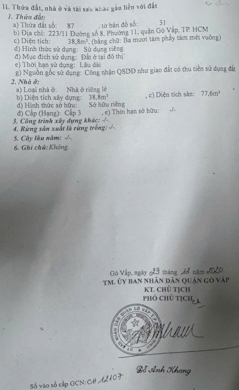 Đất hẻm 78/44/44 Nguyễn Văn Khối, Phường 11, Gò Vấp, Hẻm 8m thông, 8x23m, Cn 160 m2, 19,9 tỷ TL