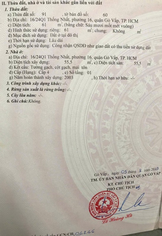 Nhà hẻm 33/21 Đường số 2, Phường 16, Gò Vấp, 3,75x16,5m, Cn 61 m2, Cấp 4, 4,3 tỷ TL