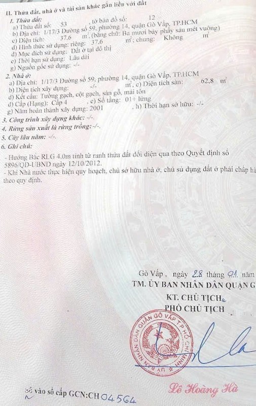 Nhà hẻm 50/1/49 Đường số 59, Phường 14, Gò Vấp, Hẻm 2m, 4x11,5m, Cn 37,6 m2, trệt 1 lửng, 3,99 tỷ TL